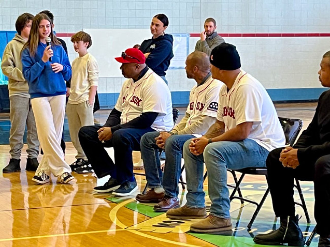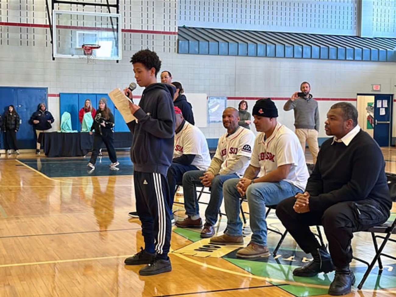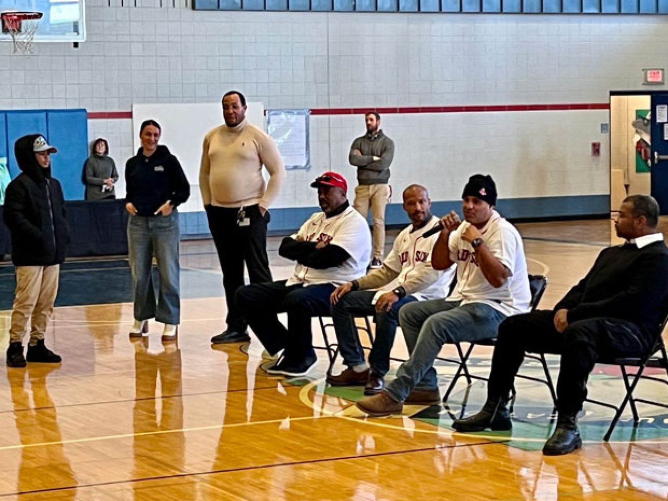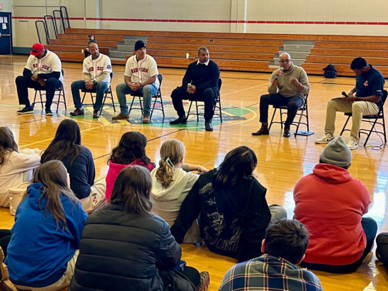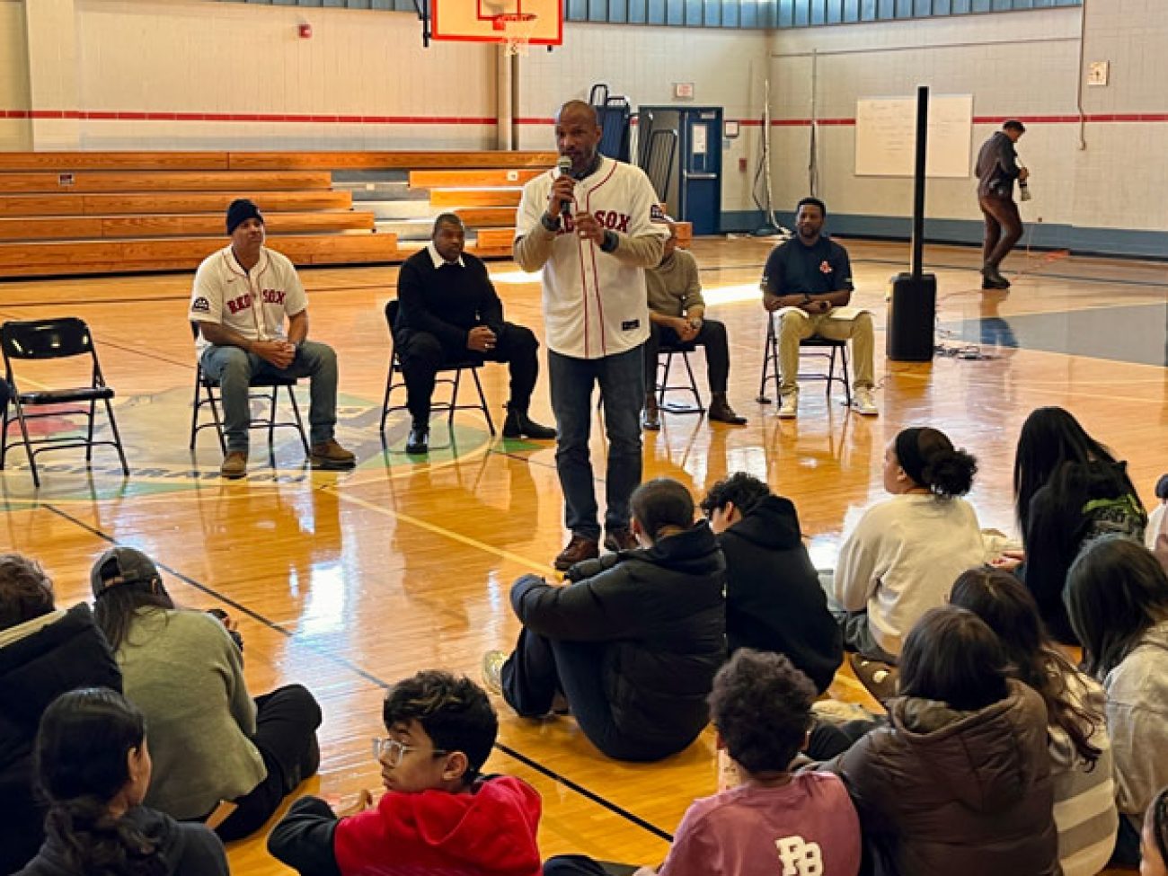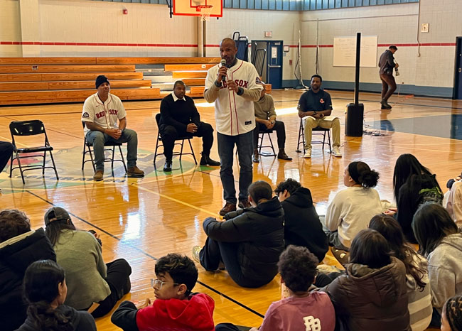 A panel of guests including Boston Red Sox alumni Sam Horn (1987-89), Darnell McDonald (2010-12) and Manny Delcarmen (2005-10), Red Sox and Boston Celtics DJ Khaleil Blair, Vice President of the Jackie Robinson Foundation Ivo Philbert and NESN reporter Jahmai Webster visited Collins Middle School to discuss the personal impact Mr. Robinson’s legacy had, and continues to have, on them.