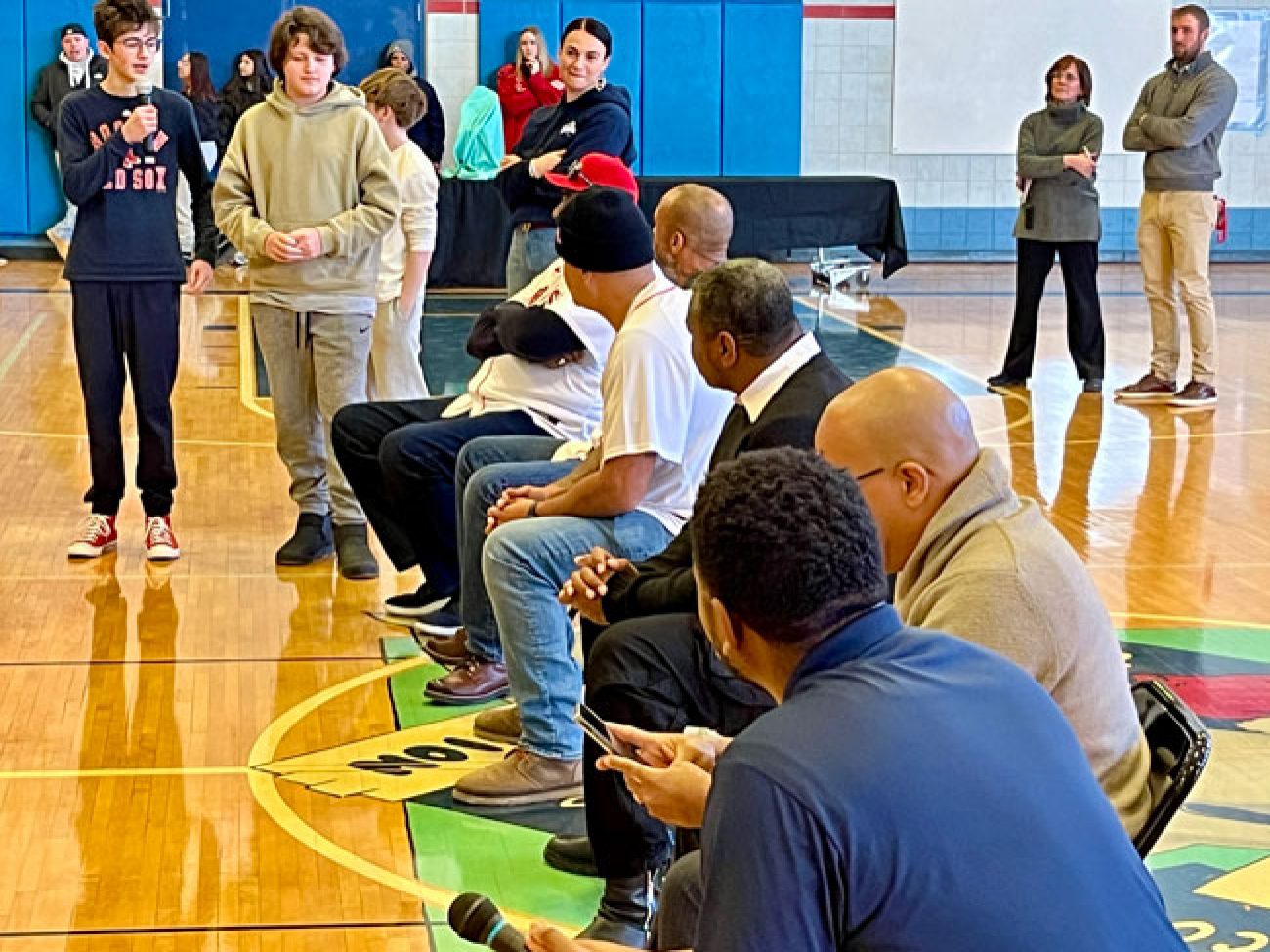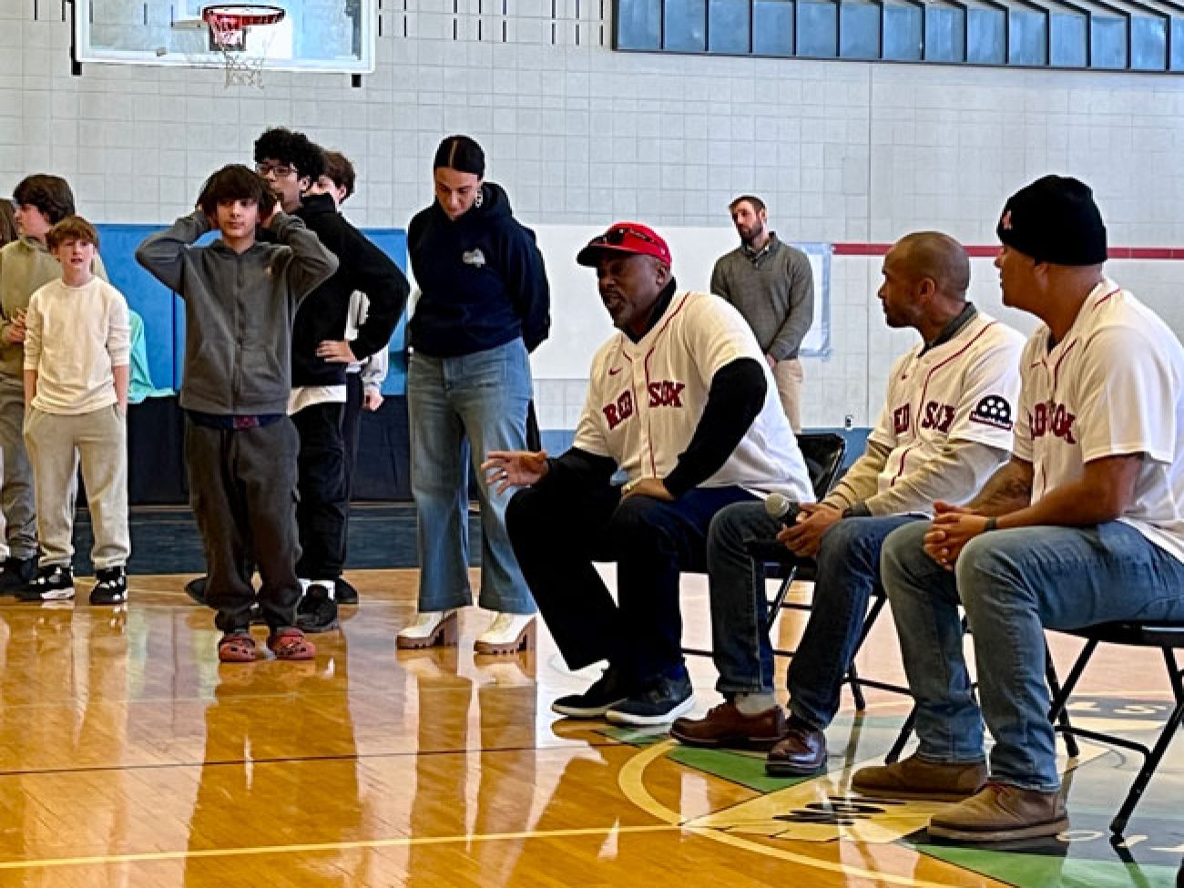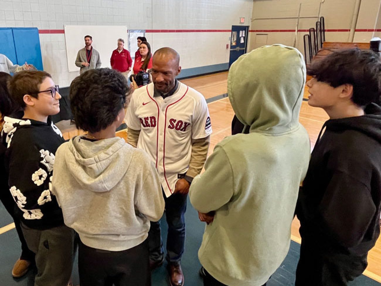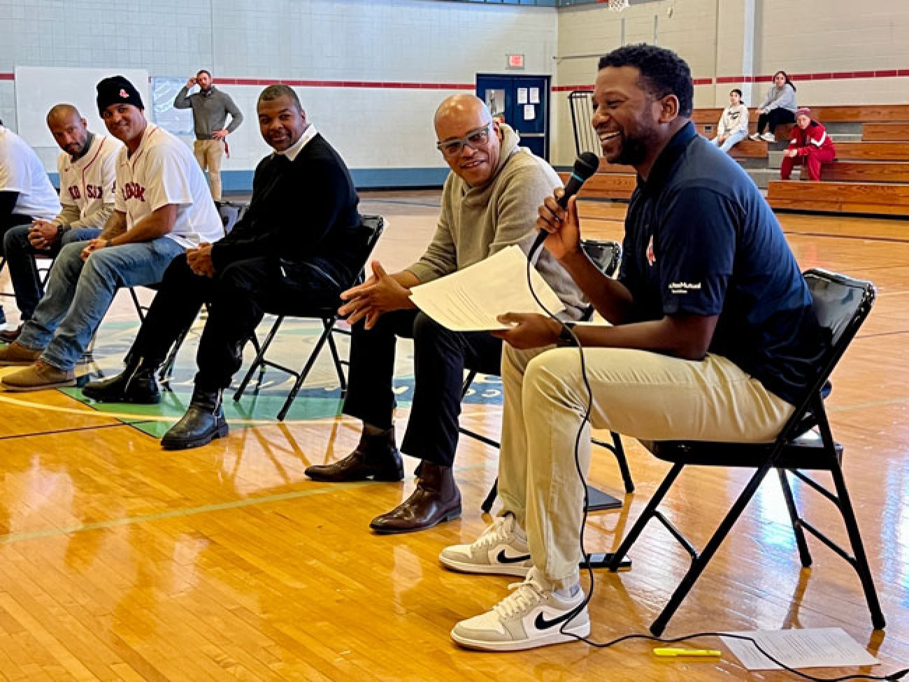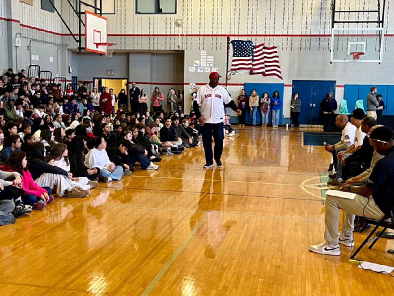 A panel of guests including Boston Red Sox alumni Sam Horn (1987-89), Darnell McDonald (2010-12) and Manny Delcarmen (2005-10), Red Sox and Boston Celtics DJ Khaleil Blair, Vice President of the Jackie Robinson Foundation Ivo Philbert and NESN reporter Jahmai Webster visited Collins Middle School to discuss the personal impact Mr. Robinson’s legacy had, and continues to have, on them.
