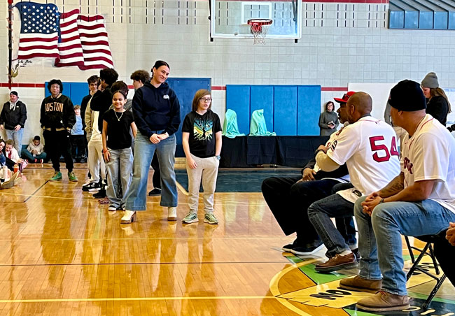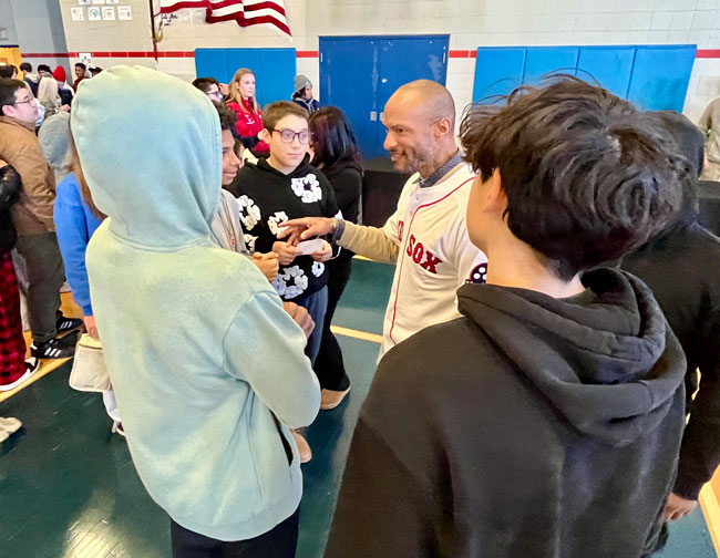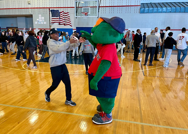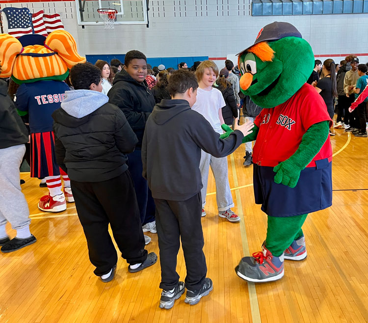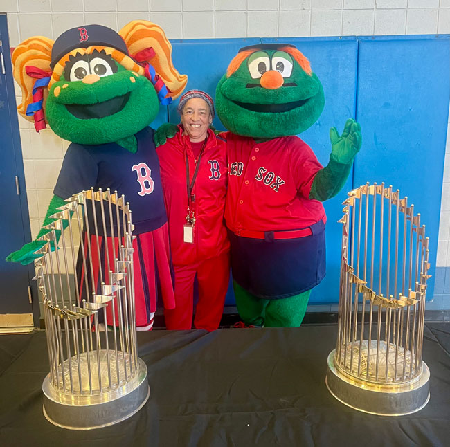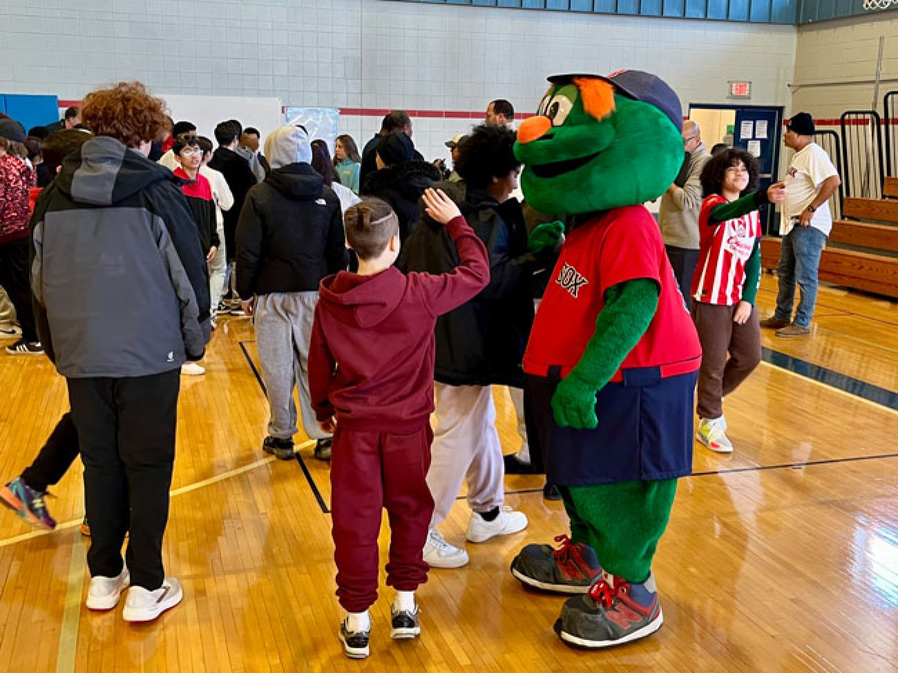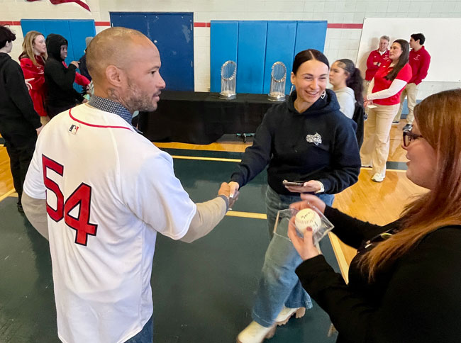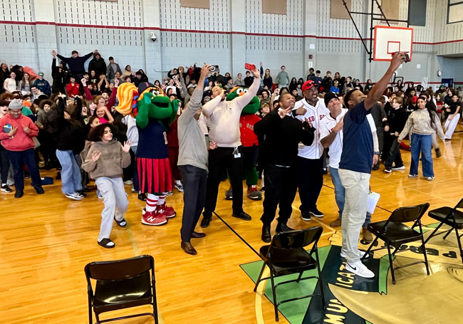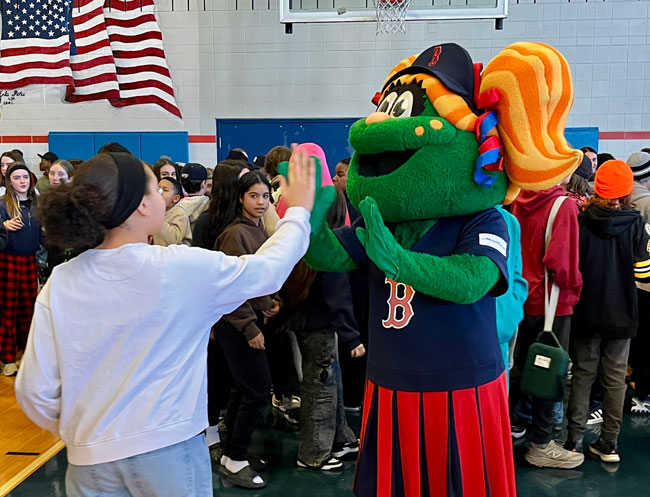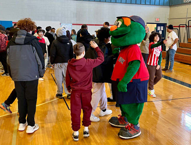The event closed with the reading of the Dick Flavin poem titled ‘Jackie Robinson’ by eighth grader Jose Toribo Francisco. Afterward, students were introduced to Red Sox mascots Wally and Tessie, and took photos of two of the Sox World Series trophies.