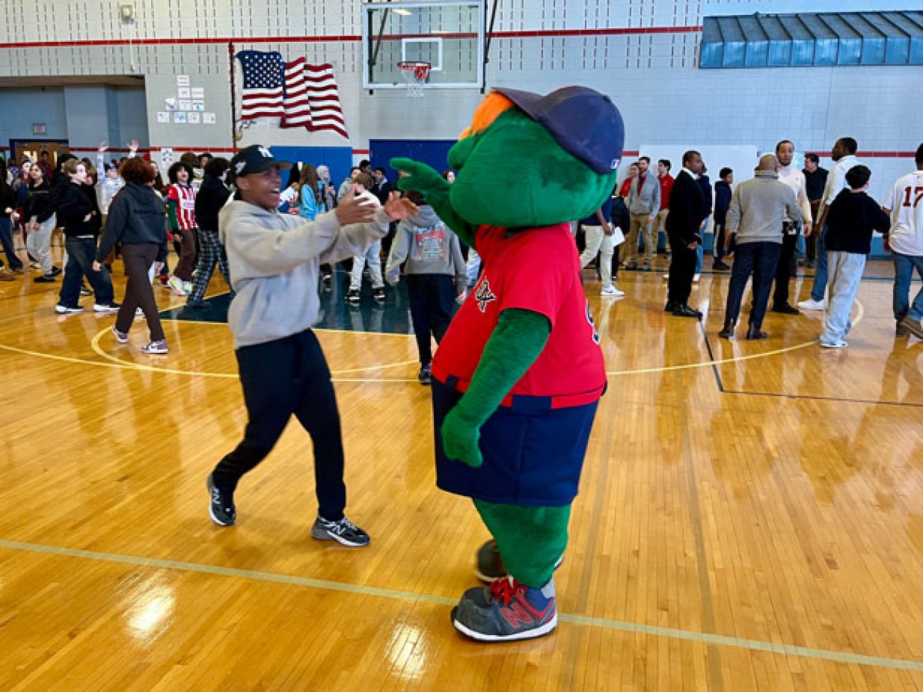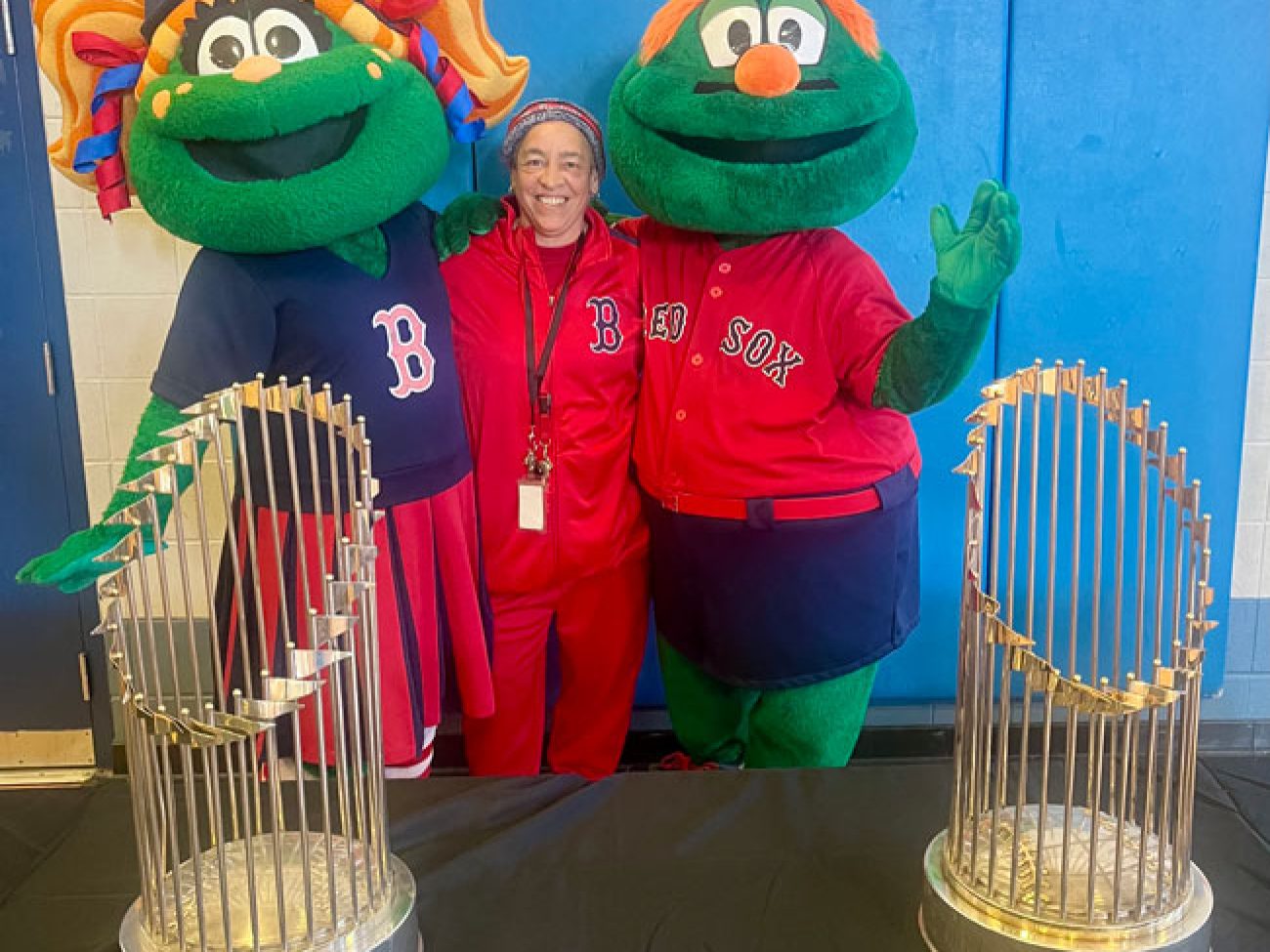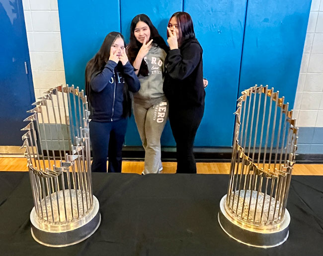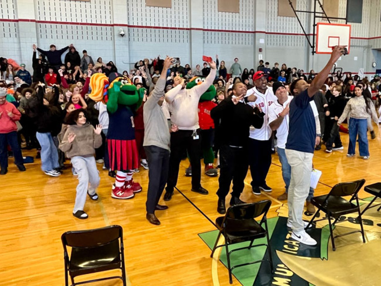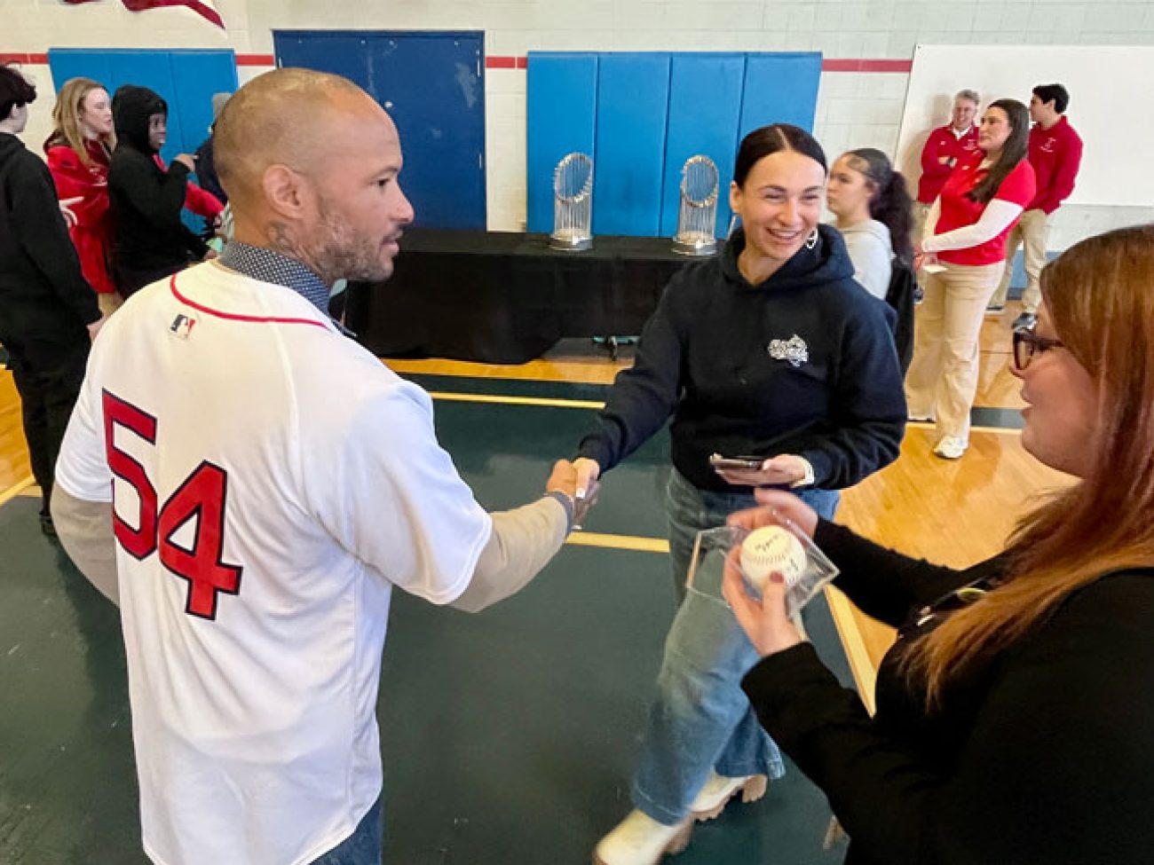 The event closed with the reading of the Dick Flavin poem titled ‘Jackie Robinson’ by eighth grader Jose Toribo Francisco. Afterward, students were introduced to Red Sox mascots Wally and Tessie, and took photos of two of the Sox World Series trophies.