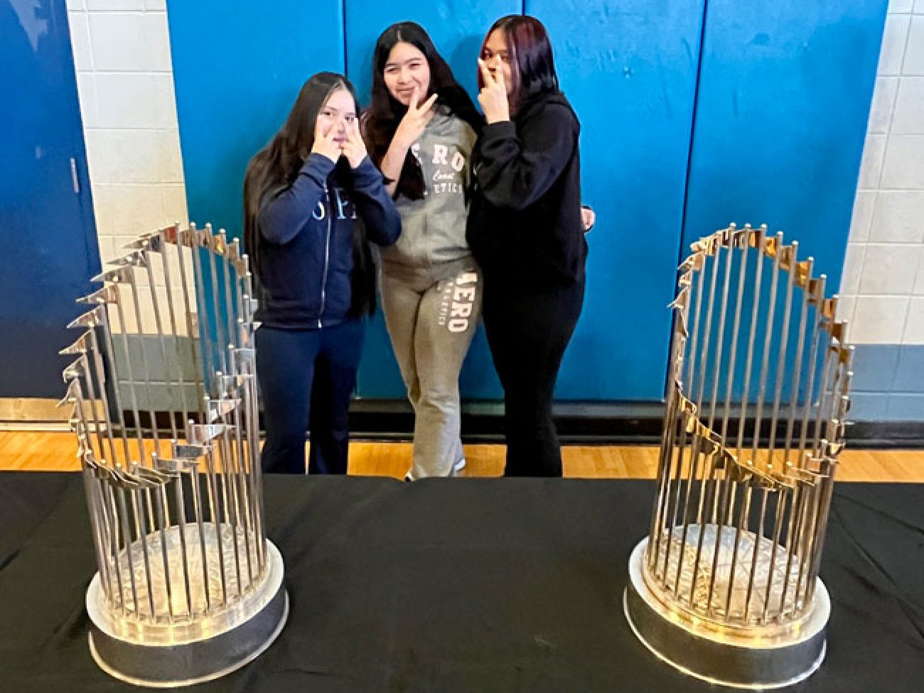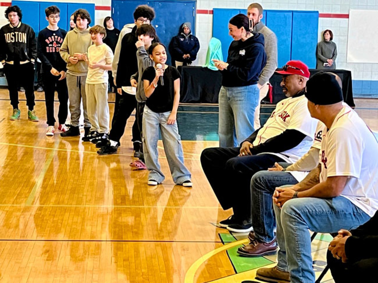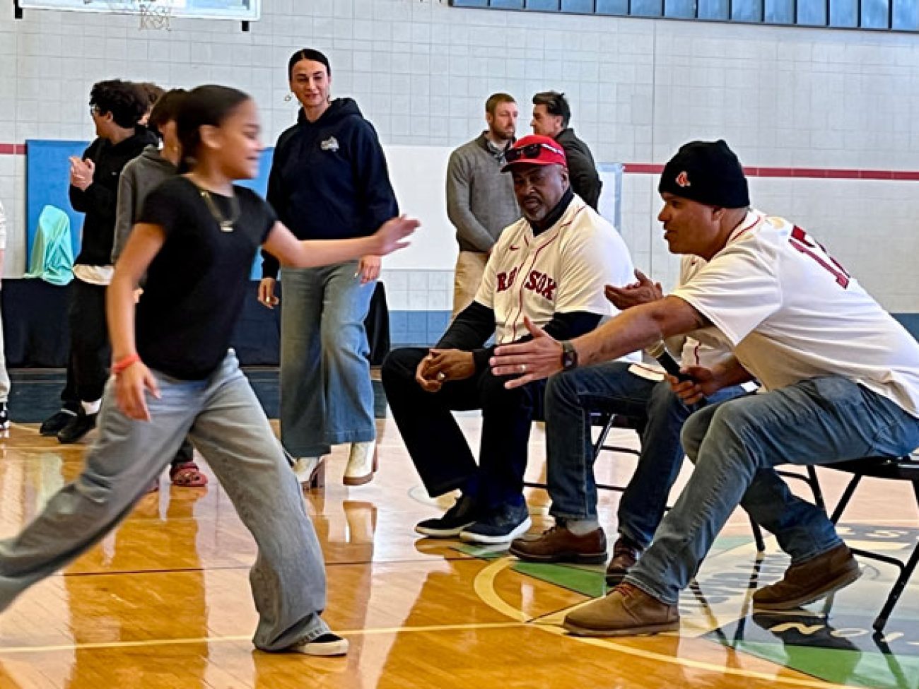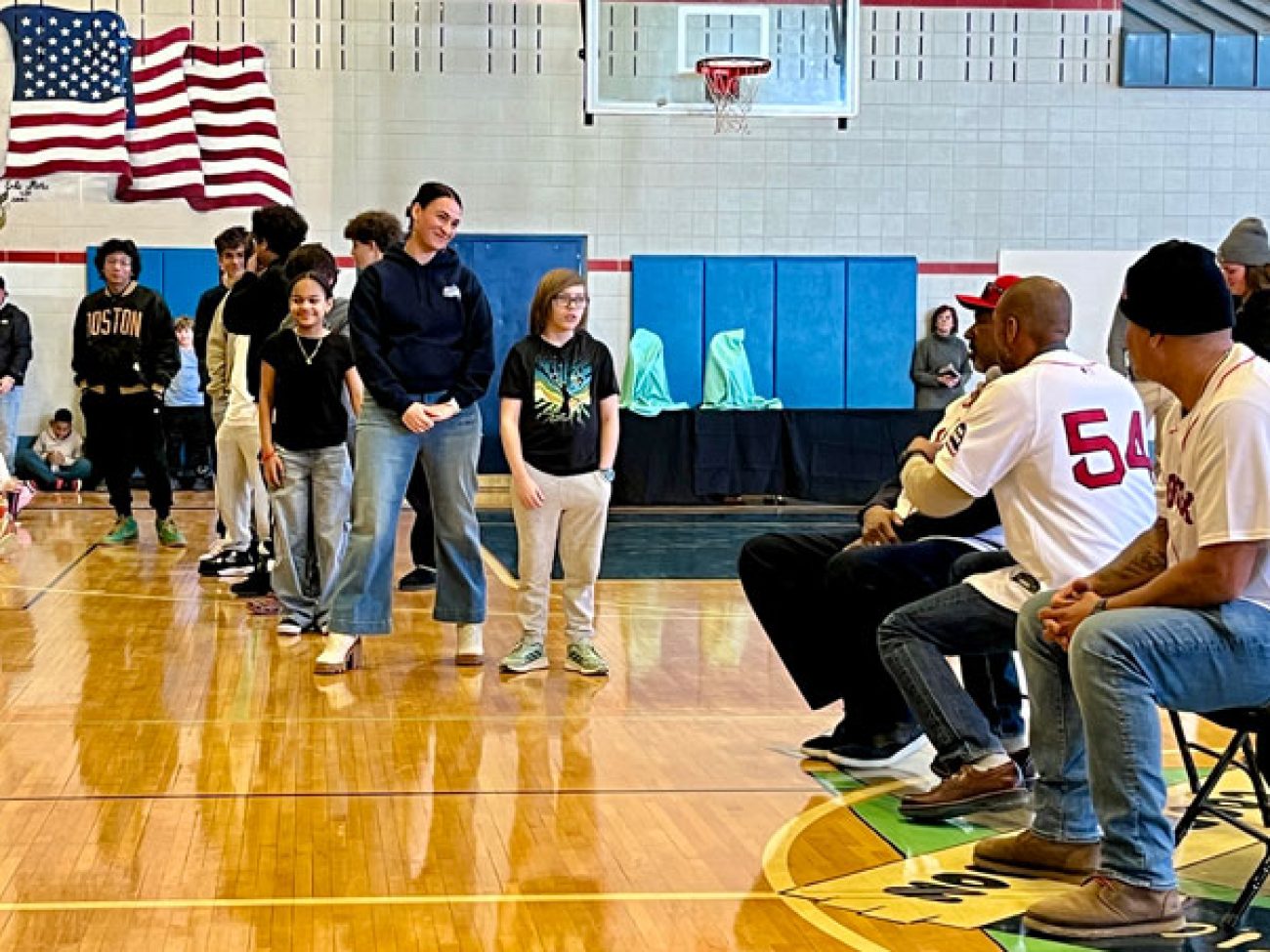 The event closed with the reading of the Dick Flavin poem titled ‘Jackie Robinson’ by eighth grader Jose Toribo Francisco. Afterward, students were introduced to Red Sox mascots Wally and Tessie, and took photos of two of the Sox World Series trophies.